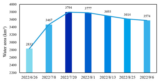 Poyang Lake is the largest freshwater lake in China, which is located in the north of Jiangxi Province, with the geographical range of 28°22′ N to 29°45′ N and 115°47′ E to 116°45′ E, and it plays an important role in flood storage and drought relief in the MLB [42]. The water area changes of Poyang Lake are shown in Figure 15. It could be seen that the water area of Poyang Lake showed a change trend of “steep rise and slow fall” during the whole flooding period. The water area of Poyang Lake first increased rapidly from 2832 km2 on 16 June to 3794 km2 on 20 July, and then decreased slowly to 3574 km2 on 6 September due to the influence of high water levels of the Yangtze River. In terms of the temporal rate of change, from 16 June to 20 July, the water area increased by a total of 962 km2 with a daily average increase of 40 km2/d. From 20 July to 6 September, the water area decreased by a total of 220 km2 with a daily average decrease of 4.58 km2/d. Figure 16 shows the spatial distribution maps of the water body in the Poyang Lake. It could be seen that there was no flood in the west, southwest, and east of Poyang Lake on 26 June 2020. On 8 July 2020, there was obvious flooding in the southwest of Poyang Lake, and a large area of the Yellow Lake flood storage area was inundated. On 20 July 2020, there was obvious inundation in the west and east of Poyang Lake. The slow decrease of the water area brought great pressure to the flood control and disaster relief in the MLB.