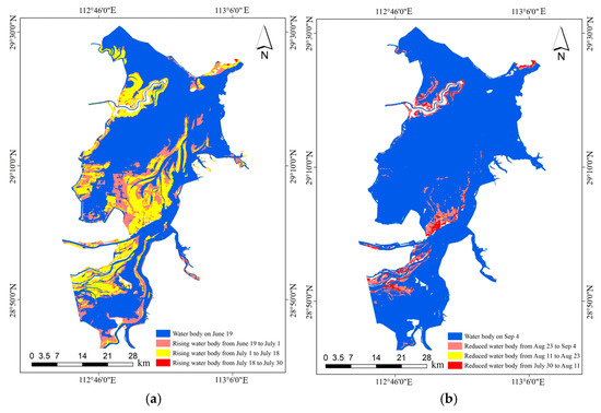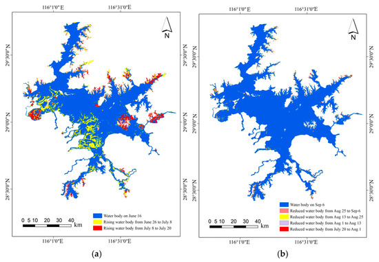 The spatial distribution maps of the water body in Poyang Lake. (a) The rising water stage, (b) the reduced water stage.