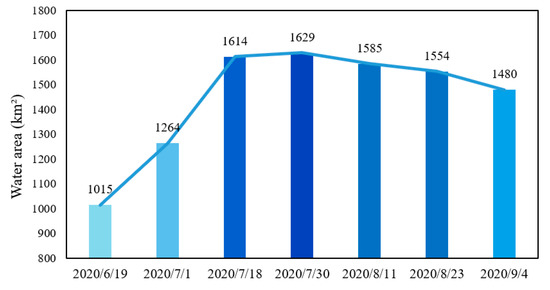 Dongting Lake is the second largest freshwater lake in China, and it is located in the north of Hunan Province with the geographical range of 28°30′ N~30°20′ N and 112°25′ E~113°15′ E, and is an important storage lake in the Yangtze River basin. However, the SAR satellite did not observe the west of Dongting Lake at the early stage of flooding, and therefore the East Dongting Lake was selected for disaster analysis in this paper. Figure 17 shows the water area changes of East Dongting Lake, and the change trend was similar to that of Poyang Lake, that is, the change trend of “steep rise and slow fall”. Its water area first increased rapidly from 1015 km2 on 19 June to 1614 km2 on 18 July, which was an water area increase of 599 km2, and then the water area continued to increase slowly to 1629 km2 on 30 July, after which the water area decreased slowly to 1480 km2 on 4 September. Figure 18 shows the spatial distribution maps of the water body in East Dongting Lake from 19 June to 4 September 2020. It could be seen that at the beginning of the flood, the middle and south of the East Dongting Lake did not appear to be inundated. As the water level rose, small lakes located in the middle and south of the East Dongting Lake joined together and inundated a large exposed area. After that, the water area slowly declined but the inundated areas did not show any significant recession.