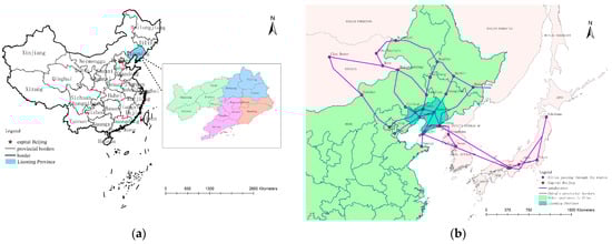(a) Position of Liaoning Province in China. (b) Main external routes of ports in Liaoning Province.