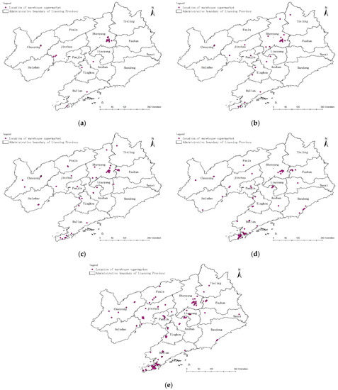 Dynamic changes in the number of warehousing supermarkets in Liaoning Province from 2018 to 2022. (a) Data for 2018; (b) data for 2019; (c) data for 2020; (d) data for 2021; (e) data for 2022.
