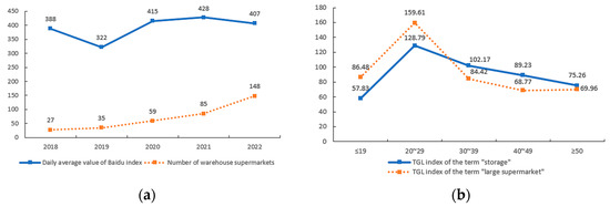 In order to reflect consumers’ concern about the operation mode of warehouse supermarkets in 2018–2022, the Baidu Index has been introduced as an indicator to reflect consumers’ concerns. Through Baidu’s term search, the relevant term data of the warehouse supermarket were not included, which indicates that the warehouse supermarket format is a new thing developed in recent years, and its relevant data are not perfect. Intercept the daily average search value of “warehousing” in Liaoning Province from 2018 to 2022 and compare it with the change trend of the number of warehousing supermarkets in Liaoning Province (Figure 4a). It can be seen that since 2019, consumers in Liaoning Province have paid more attention to the word “warehousing” year by year, and the changing trend of warehousing supermarkets in Liaoning Province is consistent with it. On this basis, the TGL index, namely the target group index, is introduced to reflect the strength or weakness of the group within a specific research scope (Figure 4b). It can be seen from the data in the figure that the 20–29-year-old group has a strong position in the search groups of the two terms, that is, the 20–29-year-old group is the main group focusing on “warehousing” and “large supermarket”.