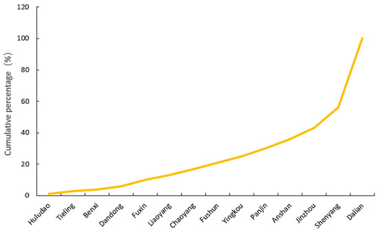 The disequilibrium index, as an indicator reflecting the distribution of warehousing supermarkets in cities in Liaoning Province [33], ranges from 0 to 1. The larger the index value, the more unbalanced the distribution of warehousing supermarkets in Liaoning Province. The calculation formula is as follows: