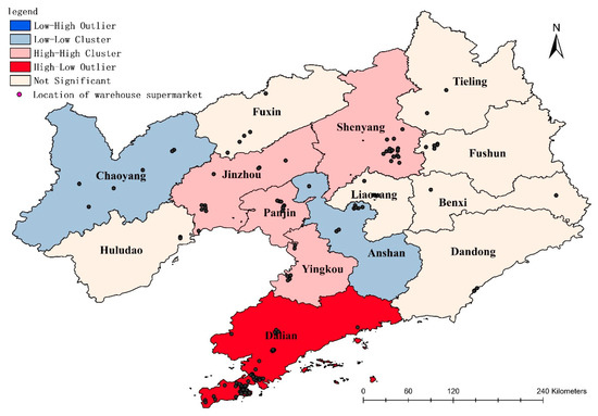 Local autocorrelation analysis of warehousing supermarkets in Liaoning Province.