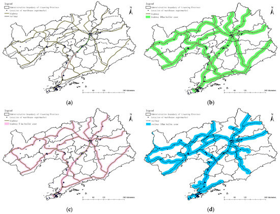 The traffic line serves as a connection between the cities and has a significant impact on logistical transportation. The commodity structure of warehouse supermarkets is comprehensive, and most of them adopt the form of large packaging and bulk sales to achieve low-priority sales [41]. Most of the sites are located in developed logistics areas, with convenient location conditions. The development of warehouse supermarkets is heavily dependent on traffic location, because it is a novel retail format that depends on the effectiveness of logistics and transportation as well as the convenience provided by location. Based on the relevant data of roads and railways in Liaoning Province (Figure 10a), it can be seen from the location distribution map of warehouse supermarkets in Liaoning Province that almost all warehouse supermarkets are located on both sides of the road, and most of them are located near traffic nodes such as intersections. For example, Dalian Aiyite Warehouse Supermarket is close to Shen Hai Expressway, and Shenyang Wenming Jiajiale Supermarket is near Danfu Expressway.