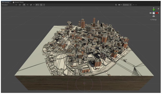 In Figure 3a,b, the system can perform 3D visualization and real-time characterization of real-world geographic information in VR and edit the map using gestures. In Figure 3c, the rotation gesture can rotate the entire 3D map clockwise/counterclockwise. In Figure 3d, the Zoom gesture adjusts the map’s scale and indicates the current zoom factor through the arrow effects of the virtual hand model. In Figure 3e–g, the gesture interface enables the map to switch between different visualization schemes quickly. In Figure 3h,i, users can also use gestures to simultaneously add markers and lines to the map for plotting. As illustrated in Figure 4, the Unity-created demo scene features portions of Shanghai as an example.