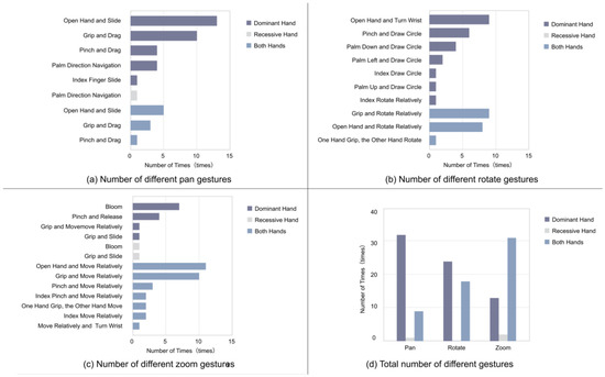 In Figure 2d, interactive hands with three tasks are integrated. During the execution of map pan, rotate, and zoom tasks, the number of interactions with the dominant hand decreases gradually. In contrast, the number of interactions with both hands increases gradually, while almost no one chooses non-dominant hand interaction. The current results show that pan gestures have an apparent dominant hand operation tendency, zoom gestures have an evident two-hand operation tendency, and rotate gestures have no clear interactive hand operation tendency.