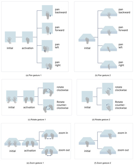 Moreover, “grip and drag with dominant hand” for pan, “grip and rotate relatively with both hands” for rotation, and “open hand and move relatively” for zoom have a high and consistent level of recognition across the respondents. This is possibly because, on the one hand, the drag-and-drop action is similar to what the user does every day and matches what the user expects from the system. On the other hand, this set of gestures gives the user a strong sense of control over the system, and the user’s hands can provide tactile feedback to make the interaction more reliable.