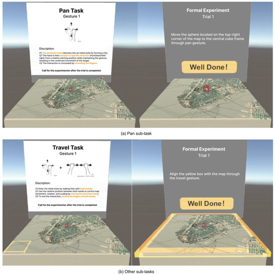 In this part, we execute a heuristic experiment of the natural gestures of map pan, rotate, and scale instructions to comprehend the user’s performance in the scene and the interactive preference for map navigation activities. The heuristic experiment is a widely used research method for collecting natural gestures [33,34,35]. It involves presenting suggestive dynamic images to participants and asking them to perform a gesture that corresponds semantically with the image. A total of 10 males and 11 females between 21 and 26 years of age (Mean = 23.71, SD = 1.45) were invited to participate in the experiment. After rectification, the vision of each subject is average or usual, with achromatopsia, color blindness, and normal stereoscopic vision. There are 19 right-handed subjects and 2 left-handed subjects. Eight individuals have extensive expertise with VR interaction. The experiment is created in Unity, as shown in Figure 1.