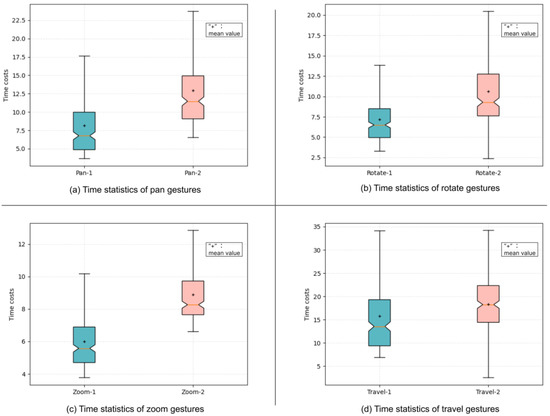 To quantify performance, the experiment recorded each participant’s time costs to complete different tasks. The task completion time for map pan, rotate, zoom, and travel tasks utilizing two groups of interface gestures were statistically assessed and presented as box plots. As shown in Figure 7, due to individual variances among participants, we cleaned the outliers with [U + 1.5IQR, L − 1.5IQR] as the boundary condition (interquartile ranges, abbreviated as IQR). We performed paired t-tests to analyze the time costs of two groups of gestures in pan, rotate, zoom, and travel tasks. The results indicate significant differences in time costs between the two groups in all four tasks, with pan (p < 1.9 × 10−15) and zoom (p < 3.8 × 10−20) showing highly significant differences and rotate (p < 0.047) and travel (p < 0.029) also showing significance. The time costs of group 2 consistently outperforms that of group 1, indicating that the gestures in group 1 have higher overall performance across all tasks.