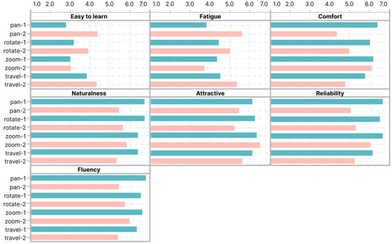 The assessment results of the Likert Scale are depicted in Figure 8. Almost all items on the scale indicate that the gestures of group 1 received higher evaluations, except for the “easy to learn” aspect. This assertion is consistent with the earlier discussion of the Travel-1 gesture’s IQR, wherein it was suggested that group 2’s static gestures that require single-handed operation are easier to trigger as compared to those in group 1. However, this ease of triggering also leads to occasional false activations, ultimately resulting in poor interaction performance. Furthermore, the Fatigue aspect of Zoom-2 is lower than that of Zoom-1, while its Attractive aspect is slightly higher than Zoom-1. However, Figure 7 illustrates that Zoom-2 requires considerably more time for successful execution than Zoom-1. We posit that while certain single-handed interaction gestures are less fatiguing on the arm muscles, they still fail to significantly enhance interaction performance.