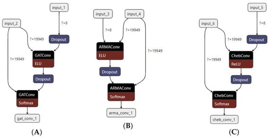 Structures of examined graph neural networks: (A) GAT, (B) ARMA, and (C) Chebyshev.