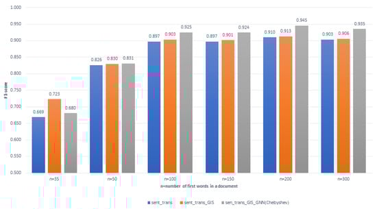 Figure 10 shows the F1 values for all tested graph neural network architectures using different document lengths. The best quality was achieved by the Chebyshev model, with an F1 measure of 0.945 for document lengths . It can be seen that the results were slightly worse at a 300 word length than at a 200 word length. It can be noticed that the best results occurred with document lengths of 200. This situation resulted from the fact that the key information about the land use of the planning zones was at the beginning of the document, which is consistent with the way of formulating text arrangements for individual areas in the plans. Such models that are used to classify documents can be sensitive to the document length because longer documents can contain more information and be more difficult to classify.