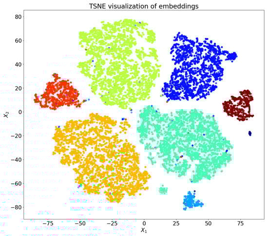 An example visualization of the classification results is shown in Figure 7, where the classification of objects according to the method from Section 4.2.1 is presented. The dimension of the embedding vector was reduced to two using principal component analysis (PCA), and the category labels were assigned the corresponding colors.