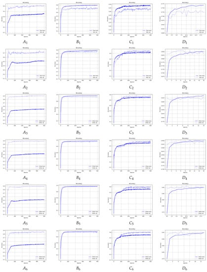 Accuracy waveforms for the (A) ARMA, (B) Chebyshev, (C) GAT, and (D) GraphSage models, which considered: 1. 35, 2. 50, 3. 100, 4. 150, 5. 200, and 6. 300 words.