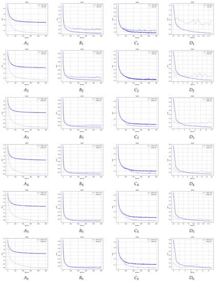 Loss waveforms for the (A) ARMA, (B) Chebyshev, (C) GAT, and (D) GraphSage models, which considered: 1. 35, 2. 50, 3. 100, 4. 150, 5. 200, and 6. 300 words.