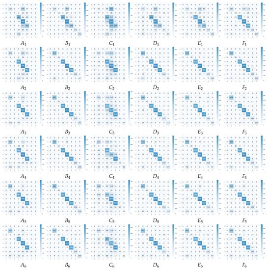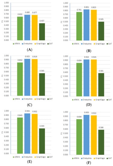 Confusion matrices for models: (A) ARMA, (B) Chebyshev, (C) GAT, (D) GraphSage, (E) XGBoost, and (F) XGBoost with the GIS, which considered 1. 35, 2. 50, 3. 100, 4. 150, 5. 200, and 6. 300 words.