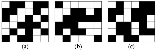 Step 3. Generate the XOR code of and and take the obtained result as the checking code (CC) of the two stages of ECCs. Create an (unit: pixel) blank binary image to represent the obtained XOR code, assumed . Then, assign by Equation (1). Here, ⨂ means an operation between two binary pixels (black or white), i.e., if the two pixels participating in the operation are the same, the operation result is a white pixel or the operation result is a black pixel.