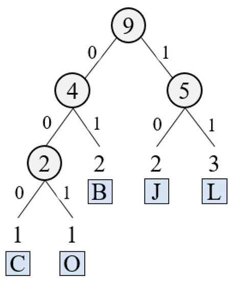 Step 2. Encode the obtained single values based on Huffman coding by the following sub-steps, i.e., (i) count total numbers of each letter in Figure 3 (the result is shown in Table 2), (ii) construct a Huffman tree based on the statistical results (the result is shown in Figure 5) and (iii) generate Huffman code for each letter based on the constructed Huffman tree (the result is shown in Table 3).