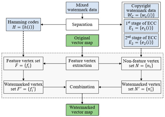 Map vertices are grouped first in this section by feature vertex extraction. Then, the given mixed watermark data will be separated into four individual parts, i.e., copyright watermark data, the first stage of ECC, the second stage of ECC and Hamming codes. Afterwards, the obtained Hamming codes will be embedded into feature vertices, and copyright watermark data and two stages of ECCs will be embedded into non-feature vertices. Finally, the watermarked feature vertices and non-feature vertices will be combined to generated the watermarked vector map.