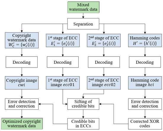 Step 2. Separate the given mixed watermark data into four individual parts, i.e., copyright watermark data , the first stage of ECC , the second stage of ECC and Hamming codes .