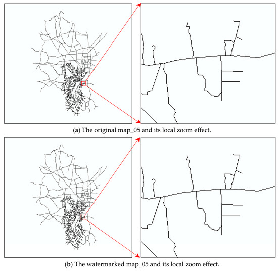 It is described in Section 4.1 that only the decimal portion of vertex coordinates are modified to embed watermark data, and the distortion of map coordinates can be controlled by setting a reasonable strength of watermark embedding. In this work, the watermark embedding strength is set to five. Accordingly, the original vector maps will not be affected significantly in visualization in theory. An experimental vector map is shown in Figure 12, as well as its watermarked counterpart. It is quite difficult to distinguish the difference between the two vector maps from the visual aspect, even in the local zoom mode.