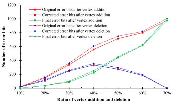 Simulation attack experiments have been conducted to verify the robustness of this scheme under map translation and rotation. The generated mixed watermark data were first embedded into the fifty experimental vector maps, and then various proportions (from 10% to 70%) of vertices were added into (resp. removed from) the watermarked data. Finally, watermark data were extracted from the attacked cover data and self-optimized adopting the designed method. The results of the watermark extraction were generated by calculating the average value of fifty vector maps. Experimental results (Figure 13) show that (i) the accuracy of watermark detection can be improved effectively by the proposed self-error-correction algorithm; (ii) the smaller the attack intensity, the better the effect of self-error-correction of watermark data, and the relationship between attacking intensity and corrected error bits is not linear; and (iii) the robustness of this scheme under vertex addition is slightly better than under vertex deletion. Here, the bit error rate (BER) is used to express quantificationally the effect of watermark extraction.