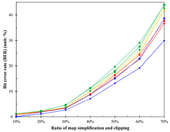Comparison results of watermark extraction after map simplification and clipping. The blue solid line, the red solid line, the green solid line and the yellow solid line denote the BER of this scheme, the BER of the scheme in [5], the BER of the scheme in [6] and the BER of the scheme in [13] after map simplification, respectively. The blue dashed line, the red dashed line, the green dashed line and the yellow dashed line denote the BER of this scheme, the BER of the scheme in [5], the BER of the scheme in [6] and the BER of the scheme in [13] after map clipping, respectively.