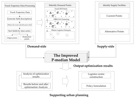 To achieve the above objectives, this paper extracts the key features from the truck trajectory data in the city and conducts an optimisation study on the location of urban logistics centres based on the improved P-median model from the perspective of urban logistics space supply and demand balance. To validate the effectiveness of the model, this paper selects Wuhan, a logistics hub in China, as an example, and optimises the locations of the current logistics centres in Wuhan. By analysing the results before and after the optimisation, more equitable spatial allocation of logistics centres, lower truck travel costs, and more uniform logistics centre services are achieved, which alleviates the current situation of tight land resources in the city and provides a scientific basis for the construction of logistics centres. In conclusion, (1) this paper aims to address the urban logistics centre location problem by using DBSCAN clustering, an improved P-median model, and incorporating the truck trajectory data; (2) the proposed method is implemented on Wuhan, China, as a case study. Some targeted suggestions have been provided to the logistics centres’ administrator and policymakers for improving the sustainable development of the logistics transportation.