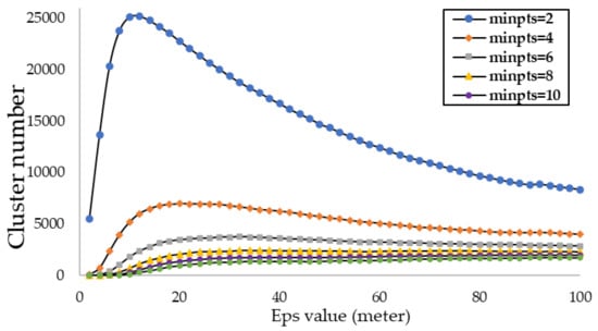 This paper implements the DBSCAN spatial clustering algorithm on these data points based on the ArcGIS platform combined with the Python programming language. The key parameters and of the DBSCAN spatial clustering algorithm will be determined by the iterative process, as shown in Figure 3. As the parameter increases, the number of clusters will first increase to a critical value, and then will gradually decrease. As the parameter increases, the number of clusters decreases gradually. When , the number of clusters increases as the increases and will tend to stabilise. When ,, a maximum number of clusters exists at this point, after which it will gradually decrease.