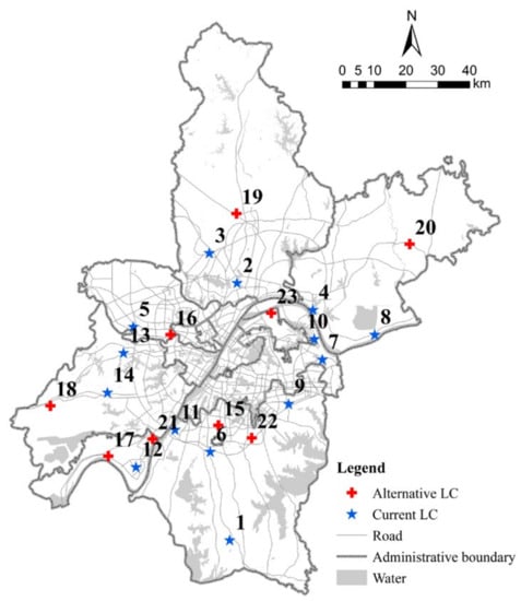 - Number of facilities P with alternative points. To facilitate the analysis of the results before and after the layout optimization, the number of facilities P determined in this paper is still 14. The alternative points are selected as alternative locations for the planned and unbuilt logistics and warehousing sites in Wuhan, and there are 9 locations in total.