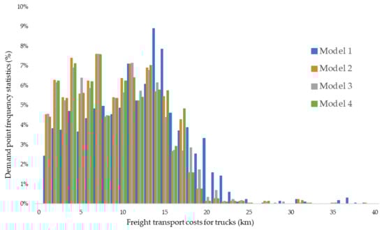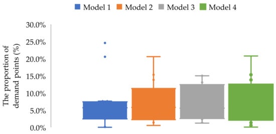 Based on the optimization results of the site location model for truck travel costs, this paper analyses the percentage of each distance of goods transported at the demand point, and the analysis result is shown in Figure 13. The main indicators of the experimental results regarding the cost of van travel are presented in Table 6. It can be seen that, with the inclusion of new alternative points, lorry travel costs will be lower. Models 2, 3, and 4 have shorter average truck travel distances than model 1. The optimised trucking costs have been reduced by an average of 22%. Moreover, the results of model 1 are lower than those of the other three models for the coverage of freight transported within 5 km, 10 km, and 20 km. By comparing the experimental results of model 3 with those of models 2 and 4, model 3 was not as good as the other two models in terms of trucking distances, travel coverage, and the proportion of demand points for services, but the discrepancy was not significant. The results show that optimisation can greatly reduce the travel cost and the waste of resources while maintaining the same number of facilities in the logistics centre.