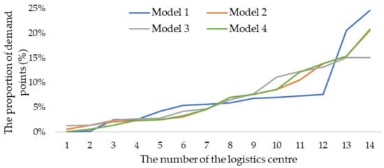 Figure 14 and Figure 15 shows the proportion of demand points served by the logistics centres before and after optimisation. It can be seen from Figure 14 that the curve of the demand points served by the logistics centres after optimisation is smoother than that before optimisation. The growth curve for model 3 is smoother than that of the other three models. Additionally, the gap between the demand points served by each logistics centre before and after optimisation is narrowing, and the spatial distribution is more reasonable. By comparing model 3 with the other three models, it can be seen that the number of demand points served by some logistics centres significantly decreases. In model 3, the largest logistics centres serve 15% of the freight demand, and the other models serve 24.6%, 20.6%, and 20.8% of the freight demand, respectively. As a result, the average number of demand points served by the optimised logistics centres is more evenly distributed, which is a significant improvement over the previous polarised situation and significantly alleviates the low service efficiency of the current logistics centre.
