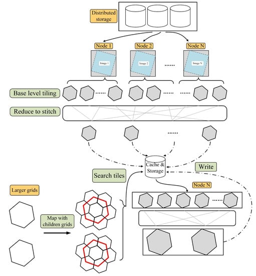 - Stitching. In the stitching part, child cells that fully cover their parent cells were firstly acquired, and the key-value pair was matched. Then the pair was flattened to a one-to-one pair using the flat Map function. In the next step, the spatial offset of each child cell in the parent cell was calculated to stitch these corresponding tiles in the correct position. The stitching process was operated in the function. Finally, each stitched tile was masked and rendered into hexagon tiles.