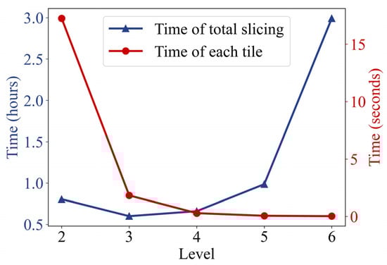 We also designed an experiment to compare the efficiency of traditional direct slicing and the stitching algorithm. The propose of stitching tiles is to reduce the disk read times; however, it would take a large amount of time for the machine to search for certain tiles before stitching. Thus, we tested the time cost of randomly generating hexagon tiles. The comparison results are shown in Figure 9. It only requires about 0.6 s on average to stitch a single tile, showing that the efficiency performance for stitching is at least four times faster than traditional direct slicing. The time cost for each tile is higher than the time consumption in other experiments, which might result from the random sampling time because we recorded the whole running time instead of separate parts. This comparative experiment indicates that it saves a great amount of time through stitching, which can increase efficiency by up to 22 times.