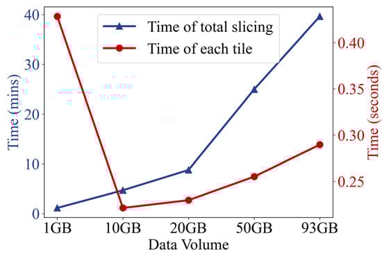 We also tested slicing efficiency for different scales of data volume. The result shows that the efficiency of tile generation declines as the data volume grows (Figure 8). Although the total time consumption of slicing for 1 GB of data is less than 2 min, it took more time to generate each hexagon tile than slicing for 10 GB of data. For the slicing of a massive number of images, the total time consumption increases immensely, but it is still acceptable for the generation time of each tile.