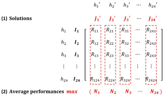 A Matrix Showing the Whole Process of the OSTO on the Case in Washington DC (k = 100). All numbers in Figure 3 are percentages. Numbers in black show the AED coverage rate when applying the solution in a specific hour (e.g., ) to cover a visitor distribution at all hours (e.g., , , , ). Numbers in red show 24 of the average performances of each solution. The number marked in red bold is the highest average performance 17.25% (when is applied to all hours).