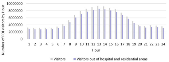 The POI visit count data in 2019 in Washington DC originates from the SafeGraph Pattern Dataset [20], indicating that the count of visits to each POI during each hour accumulated across the whole year of 2019. Considering the fact that the visit duration must last at least 4 min to count as valid for a given POI and that the visitor would be counted once in each hour if they stay for multiple hours [20], visit counts and visitors are interchangeable in our study. Since we focused on deploying public-access defibrillators, we excluded residential areas that are not publicly accessible. Considering the full equipment with healthcare facilities including AEDs in hospitals, we also excluded hospital areas. After removing the POI visit counts in residentials and hospitals, 134,850,972 POI total visit counts were used for analysis. The number of visitors per hour is shown in Figure 2. Considering the computational efficiency, we randomly sampled visitor locations per day for the optimization analysis. The sample size was . The value calculated from means the average daily visits, and further dividing by six means that one in every six POI visit counts.