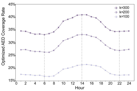 In our model, we set k as the maximum number of locations where AEDs could be deployed. We set k as equal to 100, 200, and 300 separately to explore the optimization under different situations. The distance S beyond which a POI site is considered uncovered is set as 100 m as suggested by the AHA [5]. To simulate the mobility of visitors, we randomly spread out the visitors of each POI in each hour into a 5 min walking circle. Thus, the (the number of POI visitors to be served at site i) that was used to maximize the (the number of covered POI visitors) in the maximizing function () was set to 1. Hence, the value is only determined by (whether the visitor is covered or not). The radius of the walking circle is calculated as 414.3 m based on the average comfortable gait speed (138.10 cm/s) of all the adults of different ages [35]. For each k value, we conducted the first stage of the OSTO, and then compared the trendlines of the AED coverage rate across 24 h between different ks. Since trends were similar between different ks, we conducted the second stage of the OSTO only with k equals to 100. The trend of the average performance () of each solution across 24 h was then calculated. We used the Python (Python 3.7.11) programming language to code the algebraic formulation of the model and used the Gurobi [30] solver to solve the optimization problem. The whole process took 446,293.68 s of computing time with the use of a workstation with Intel® Xeon® CPU E5-1650 6 cores 3.78-GHz processor and 128 GB of RAM.