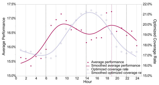 Comparison between the Average Performance of Optimized AEDs and the Optimized AED Coverage Rate across 24 h (k = 100). The average performance of each set of optimized AEDs () refers to the average performance applying each set of optimized AEDs to 24 sets of visitor distributions. The smoothed line is calculated based on a cubic spline with a lambda of 0.05.