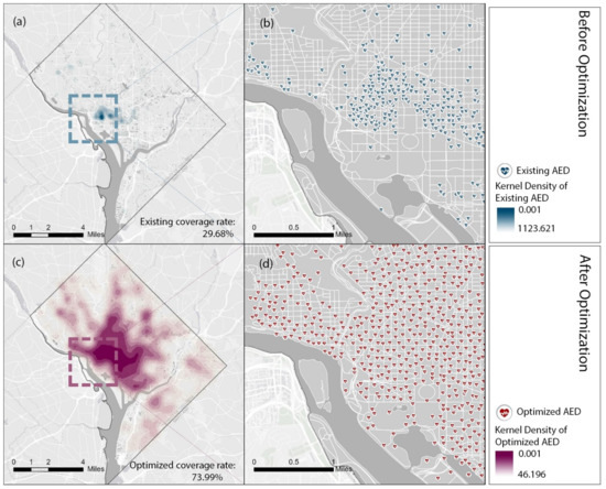 Comparison of the Distributions between Existing AEDs and Relocated AEDs in Washington DC. (b,d) shows the detailed locations of existing and relocated AEDs in a zoomed area. The kernel density maps (a,c) are computed based on the locations of existing and relocated AEDs.