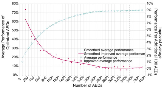 In view of the similarity of the trends of optimized AED coverage rate between different ks, it is extrapolated that, regardless of the k value, the average performance of optimized AEDs will always reach the highest at 19:00. Therefore, we computed the cost–coverage increment curve based on the visitor distribution at 19:00. From the average performance curve (Figure 8), the average performance increases with more AEDs at first. However, the plateau is reached after 3600 AEDs. From the curve of improved average performance (cost–coverage increment curve), the gain of improved performance per additional 100 AEDs is decreasing monotonically. After the threshold of 3600, the performance will only increase marginally. The improved average performance per additional 100 AEDs () is shown as (). Both smooth lines are calculated based on a cubic spline with a lambda of 0.05.