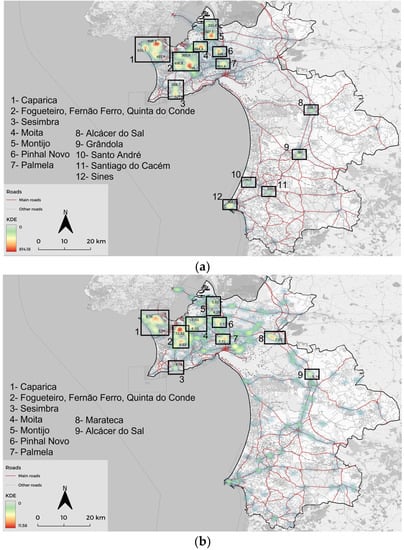 The analysis of KDE maps for datasets I and II allows the identification of several high-density regions (HDRs) of accidents (Figure 2). For dataset I, all accidents, the maximum density found for a 10 m pixel is 850 RTAs; for dataset II, RTAs with a serious injury or fatal victims, the maximum density is 12 accidents per 10 m.