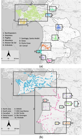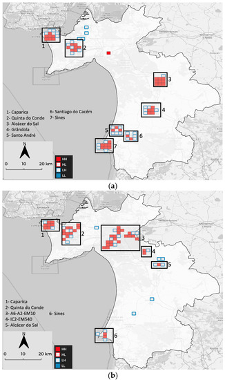 The location of the first seven north–western HDRs coincides in both datasets with minor differences. For dataset II, in the eastern area, the Alcácer do Sal HDR is maintained and a new one emerges in Marateca (Figure 2b). Apart from this, there is a scattered pattern with no other clear HDRs in the latter dataset in the eastern region.
