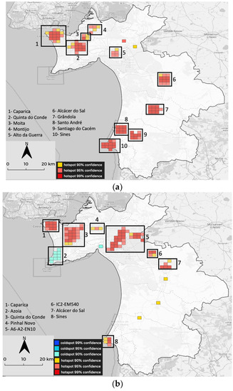 Considering dataset II, new observations are made with the Azóia region emerging as a coldspot (90% confidence) and a new, relevant hotspot region that comprises the junction between A6-A2-EN10, where the two most important highways that cross the district join the National Road that goes to the Setúbal city center. A new hotspot is identified in the crossroads between IC2 and EM540, just north of the previously identified Alcácer do Sal hotspot.