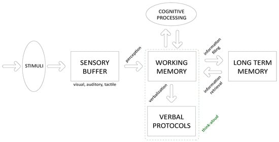 The basic principle of the think-aloud method is that the participants verbalise all their thought processes aloud while working with a product. This principle allows the researcher to gain a deeper insight into the participant’s cognitive processes. The output of the verbalisation is a verbal protocol (i.e., recorded verbal statements). By analysing the participants’ statements, it is possible to obtain their attitudes toward a product’s design and to find out their expectations for the product. In this way, a model of the participants’ behaviour is established, and this can be used to modify the product [12]. For the process of verbalisation from working memory, only verbal information can be considered. Thus, it is important to think carefully about the test scenario (tasks given to participants) that directs the testing process. If a participant is given a task with an elevated level of cognitive load, then there may be a problem with the verbalisation of ideas and an inability to transfer information to working memory. Alternatively, if the participant is given a task that is too easy, it can be solved automatically, which is again difficult to put into words [13]. A model of the human cognitive system is given in Figure 1.
