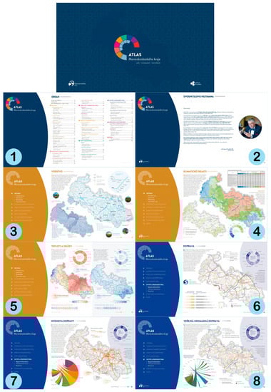 The study focused on the evaluation of the Atlas of the Moravian-Silesian Region: People, Business, Environment [55]. The study aimed to determine the usability the atlas and identify potential issues concerning selected topics in the atlas, as well as collecting participants’ opinions on the product. The atlas presents spatial information using cartographic methods in the form of thematic maps and graphic illustrations. The atlas is divided into several chapters containing maps, graphs, diagrams, and illustrations. Figure 3 shows examples of the pages from the atlas that were used in the study.