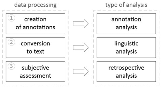 After testing, the output was in the form of audio data (verbal logs). During the study, three directions were defined on how to use, process, and analyse the measured data (see Figure 5). The first and most fundamental option was the production and analysis of annotations, which is the main essence of the think-aloud method. The audio data were separated into segments, the participants’ activity was logged manually for these segments, and the segments were annotated. The statistics of annotations were then used to calculate usability metrics. The other two proposed analysis options were additional options for the final evaluation. These were linguistic or retrospective analyses. All three analysis options were used to evaluate the usability of the atlas. These methods are described in more detail below.