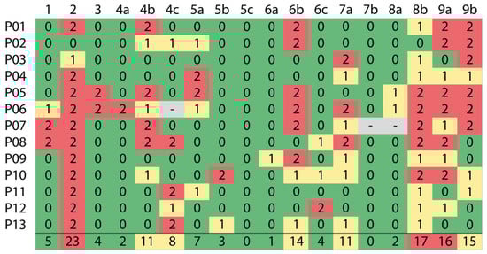 In addition to the success rate score, the accuracy of the participants’ responses was evaluated using the error analysis method. The researcher conducted an assessment, either through annotation or linguistic analysis, to determine the level of difficulty experienced by the participants in completing the assigned tasks. A scale ranging from zero to two points was used to rate the difficulty of each task from each participant’s perspective, where zero represented easy task completion, one point indicated partial success or difficulty in completion, and two points signified failure to complete the task. The table of error scores (refer to Figure 8) was compared with the task completion and success scores (refer to Figure 7), and any correlation between the two was identified as an area requiring improvement.