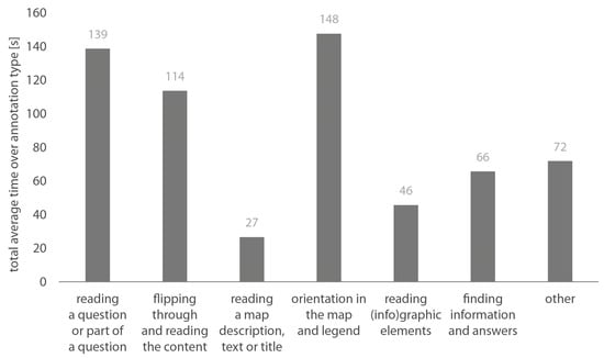 The next step involved comparing the average time for each type of annotation. Figure 10 shows the results of this comparison. On average, the longest type of annotation was searching for information in a map or legend (148 s). Participants often revisited some of the questions they had been asked to read out loud, taking an average of 139 s. The third longest part of the test was manipulating the atlas, taking an average of 114 s. On the other hand, participants spent the least amount of time reading the descriptions of the maps, simply skimming over them without delving into the text, and this took an average of only 27 s for all tasks combined.